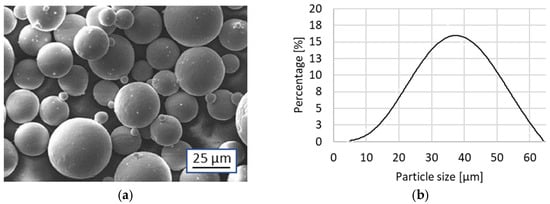 The experiments were conducted using commercially sourced Ti6Al4V powder. The raw material consisted of spherical particles ranging from 18 μm (10th percentile) to 50 μm (90th percentile) in diameter, with a median of 32 μm (Figure 1). The chemical composition of the material is provided in Table 1.