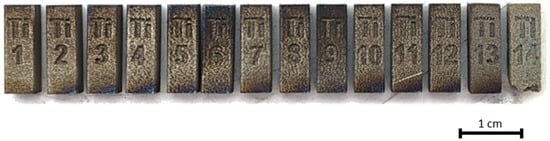 The samples were then heat-treated to eliminate residual thermal stresses and to simulate real operating conditions. The process involved heating to 840 °C over 4 h, holding at that temperature for 2 h, and slowly cooling to 150 °C in a closed furnace. Finally, the samples were separated from the build platform using wire electrical discharge machining. The obtained samples are illustrated in Figure 2.