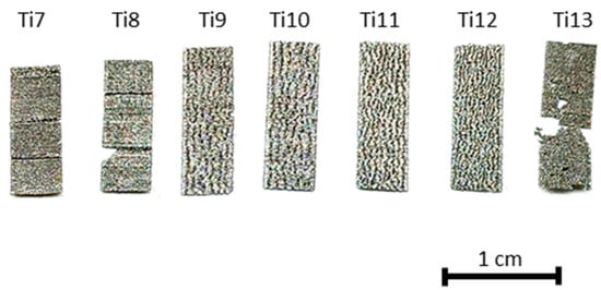 Most of the tested process parameters resulted in well-formed, conformal cuboid samples. Ti1–Ti9 showed no visible signs of porosity, Ti10–Ti13 appeared visibly altered, and Ti14 had a strong tendency to crumble even under minimal stress. Ti15–Ti18 failed to form due to insufficient energy input. It can be concluded that the experimental design effectively investigated the entire process spectrum, from minimal porosity to complete particle aggregation failure.