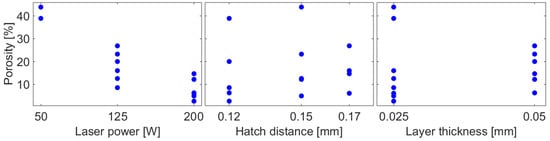 Effect of laser power, hatch distance, and layer thickness on the porosity of the cuboid samples made from Ti6Al4V alloy.
