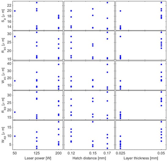 Effect of laser power, hatch distance, and layer thickness on the surface roughness (Sa), linear roughness parallel to the growth direction (Rac), linear roughness parallel to the building platform (Rap), linear waviness parallel to the growth direction (Wac), and linear waviness parallel to the building platform (Wap) of the cuboid samples made from Ti6Al4V alloy.