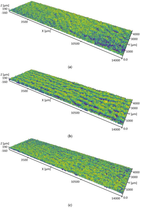 The collected data were processed with a mild noise reduction filter and used to extract images and profiles for analyzing surface morphology, roughness, and waviness in both parallel and perpendicular directions with respect to the sample build direction. Average roughness and average waviness were calculated according to ISO 4287 [] standards, using a cut-off wavelength of  [].