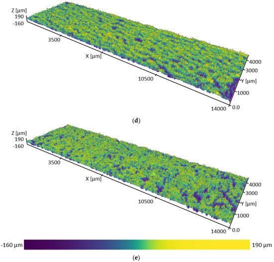 The analysis revealed that the 10× objective reduced scanning times by approximately 20 times compared to the 20× objective, while maintaining a high point acquisition rate and minimal differences in roughness measurements. In contrast, the 5× objective demonstrated excessive inaccuracy. Consequently, all the samples were analyzed using the Nikon T Plan SLWD 10×/0.20 objective, with maximum brightness and detector sensitivity, 35% overlap between the fields of view, and continuous scanning mode. The accuracy of the obtained measurements exceeded 600 nm (with a 95% confidence level), while the repeatability was better than 20 nm [].