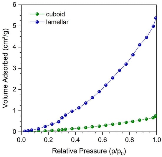 Representative adsorption branch of the N2 physisorption isotherms measured at 77 K on the Ti13 cuboid and lamellar sample, showing a type III isotherm []. The linear range for BET analysis is limited to the first 3 points.
