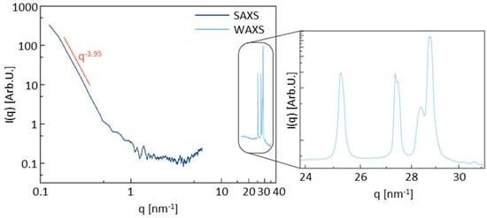 Intensity of the scattered X-ray radiation as a function of the transferred wavevector in the small-angle X-ray scattering (SAXS) and wide-angle X-ray scattering (WAXS) tests conducted on the Ti9 lamellar sample.