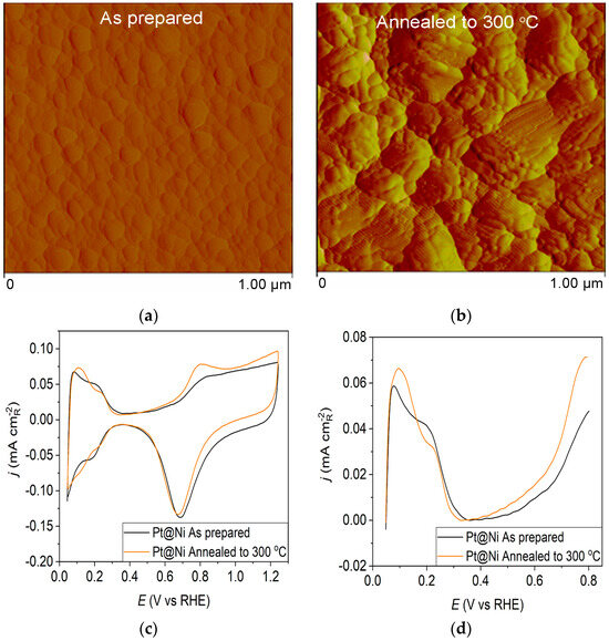 For the Pt@Ni electrode annealed at 300 °C (Figure 2c—orange curve), the voltammogram is very similar to the as-prepared one (Figure 2c—black curve) in the hydrogen adsorption zone. Still, it demonstrates an increase in current in the oxide region. The increase in peak current at 0.075 V might indicate that thermal annealing causes changes in the specific surface structures because of the rearrangement of atoms on the surface in favor of the (110) plane. The peak at 0.8 V, which results from the adsorption of OH− anions at the surface, shows the same growth trend upon annealing, indicating an increase in surface oxophilicity.