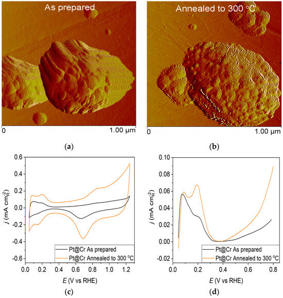 The Pt@Cr electrode annealed in H2/Ar to 300 °C (Figure 3d—orange curve) displays an increase in current at 0.195 V compared to the voltammogram for the as-prepared catalyst (Figure 3d—black curve). This feature is characteristic of hydrogen adsorption at (100) step sites on (111) terraces with a contribution from (100) steps near (100) terraces for the same potential [19].