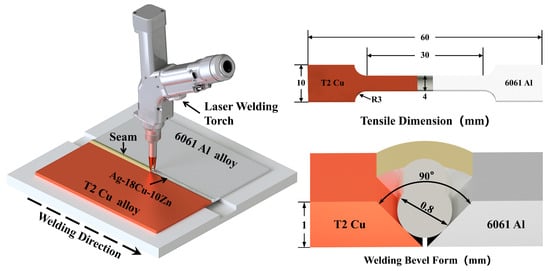 Copper alloys are extensively employed in the electrical and automotive industries due to their superior electrical conductivity, thermal conductivity, and ductility. Aluminum, while exhibiting similar electrical properties to copper, offers the additional advantages of lower cost and higher specific strength. Consequently, aluminum/copper dissimilar metal welding technology has progressed significantly in recent years. In new energy vehicle battery modules, aluminum/copper busbar joints are commonly joined by micro-riveting or mechanical-fastening methods. However, these methods result in increased weight and stress concentrations, and elevated electrical resistivity [,]. Therefore, there is a pressing demand for joints that are lightweight and exhibit good electrical conductivity. In microelectronic packaging, aluminum and copper are essential materials for electrical interconnections, and high-quality aluminum/copper joints provide excellent electrical contact performance []. Expanding the application of aluminum/copper dissimilar alloy connections will significantly advance related industries.