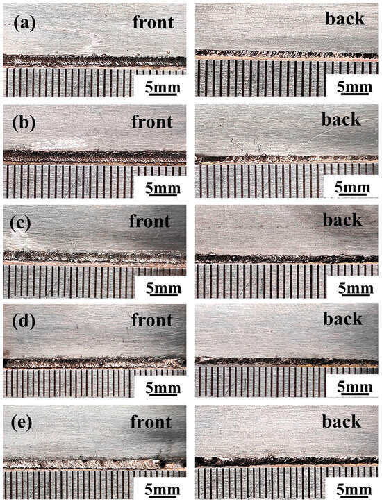 Macro morphology of joints: (a) 650 W; (b) 700 W; (c) 750 W; (d) 800 W; (e) 850 W.