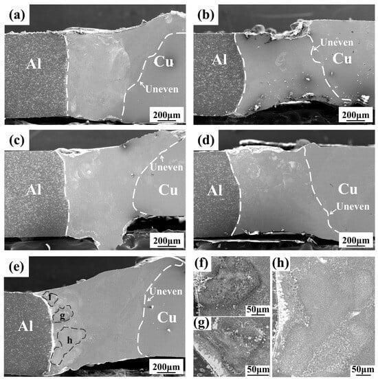 As shown in Figure 2a–e, the overall shape of the joint is satisfactory under different laser powers, with no welding defects such as undercut, spatter, incomplete penetration, lack of fusion, or cracks. Figure 3a–d illustrates that the weld cross-section under various laser powers also shows no significant defects. The interface on the aluminum side appears relatively flat, while the interface on the copper side is irregular. This difference can be attributed to the higher thermal conductivity of the copper base material compared with that of the aluminum base material. Even with laser offset, the copper side experiences less melting, and as a result, the interface retains the beveled shape from before welding. As shown in Figure 3e, three areas with different morphologies appear at the interface front on the aluminum side compared with the center of the weld, as shown in the magnified images in Figure 3f–h. These differences are presumed to result from an increased amount of base metal melting, a longer molten pool duration due to the higher laser power, and a greater diffusion of the alloying elements, leading to a more intense alloying reaction. Figure 3f,g are closer to the heat source during welding and more aluminum elements are involved in the reaction, thus exhibiting a contrast more similar to the aluminum base material compared to Figure 3h.