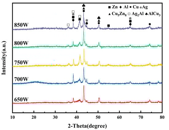 The X-ray diffraction (XRD) patterns in Figure 4 show that the primary phases in the weld remain consistent across different laser power levels. Solid solutions of aluminum, copper, silver, and zinc, as well as the intermetallic compounds AlCu3, Ag2Al, and Cu5Zn8, are consistently detected. Therefore, variations in laser power do not affect the types of main phases present in the weld. The diffraction pattern indicates a slight increase in the content of the Zn-based solid solution and Ag2Al in the fusion zone when the laser power is set to 750 W. Additionally, as the laser power increases, the content of AlCu3 intermetallic compounds in the weld gradually rises.
