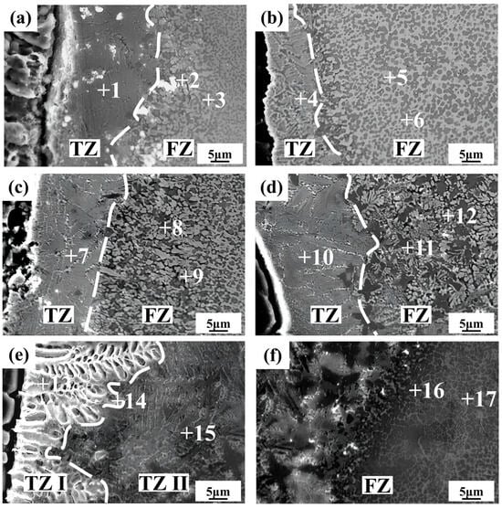 As shown in Figure 5a–e, a transition zone (TZ) exists between the aluminum alloy and the weld, and its width increases with the rise in laser power. The gray microstructure of the TZ is densely distributed but irregularly oriented, and the grain size of the columnar crystals is larger, resembling a feather-like morphology. The fusion zone (FZ) consists of black and white grains. Figure 5a shows that the TZ width is inconsistent, suggesting that the energy provided by the 650 W laser power is insufficient and unstable, leading to inadequate elemental diffusion and insufficient molten pool stirring, resulting in heterogeneous weld microstructure. Figure 5b shows that the increased laser power leads to homogenization of the TZ, with an overall width of 13 μm and a slight increase in the size of black grains in the FZ at 700 W. As shown in Figure 5c,d, from 750 W to 800 W, the increased heat input enhances elemental diffusion at higher temperatures, accelerating the migration of aluminum atoms from the base material into the molten pool, which widens the transition zone. The grain growth rate in the FZ also increases with the higher welding energy and extended molten pool retention time, resulting in the coarsening of black and white grains, transitioning from equiaxed grains and network structures to dendritic and irregularly oriented columnar crystals. As shown in Figure 5e, two distinct transition zones, TZ I and TZ II, are observed at 850 W. The morphology of TZ I differs from those at other laser powers, displaying coarse dendritic crystals oriented perpendicularly to the base material interface, with varying dendrite widths. Compared with point 15 in TZ II, point 13 in TZ I shows significantly higher levels of zinc and silver and lower levels of copper. This may be due to the long-range diffusion of zinc, silver, and copper atoms, facilitated by sufficient welding energy, converging in TZ I along with a large number of molten aluminum atoms from the base material. The larger temperature gradient promotes the nucleation and growth of coarse white dendrites of Zn, Ag, and Al elements, while Cu elements are rejected to the solid–liquid interface frontiers and segregate, forming TZ II in combination with other elements. This also explains why TZ II exhibits a similar morphology to other laser powers, but with higher copper content at point 15. Figure 5f shows the fusion zone at 850 W. The size of the black silver-poor grains further increases with irregular distribution, and the morphology of the white silver-rich grains becomes reticular. This microstructure distribution negatively affects the mechanical properties of the joint.