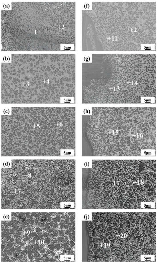 As shown in Figure 6a–e, similar to the FZ on the aluminum side, black and white microstructures appear in the center of the welds. With the increase in laser power, the refinement effect of the white grains on the black grains gradually weakens, leading to an increase in the size of the black grains, evolving from small spot-like grains to coarse dendritic structures. Simultaneously, as the black grains grow, the zinc and silver content in their composition decreases, as indicated by points 2, 4, 6, 8, and 10. This suggests that the zinc and silver content has a significant effect on the refinement of the black grains. At lower power levels, these elements promote the nucleation of black grains and inhibit their growth. Figure 6e shows that the black grains contain a substantial amount of hard and brittle aluminum–copper intermetallic compounds, which significantly degrade the mechanical properties of the weld center’s microstructure, potentially leading to joint fracture during tensile testing, as shown in Section 3.4.3. Combining the XRD diffraction results (Figure 4), the possible phase compositions and EDS elemental composition analysis of various microstructures in the weld center region are summarized in Table 4. The white grains are silver-rich phases, primarily consisting of (Al) + Ag2Al + Cu5Zn8, while the black grains are silver-poor phases, primarily consisting of (Al) + AlCu3.
