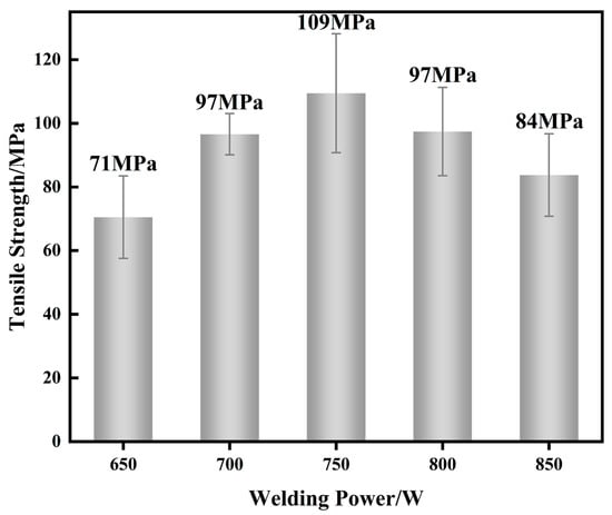 As shown in Figure 8a, the weld hardness on the copper side is significantly lower than on the aluminum side. The weld hardness reaches its peak at 850 W, which is attributed to the high heat input generating a large number of intermetallic compounds (e.g., Ag2Al, AlCu3). The fluctuating hardness in the weld center is due to the coexistence of softer white grains and harder black grains. The weld zone on the aluminum side exhibits a stable hardness, which helps to reduce residual stresses, achieve uniform stress distribution, and lower the risk of brittle fracture. Figure 8b,c illustrates that the base material softens under different laser powers. In the heat-affected zone (HAZ) of the Cu base material, the Vickers hardness ranges from 63 HV to 104.5 HV, with a reduction of about 40 HV, while in the HAZ of the Al base material, the Vickers hardness ranges from 67.3 HV to 92.7 HV, with a reduction of about 25 HV. However, the width of the softened zone in the base material is not affected by laser power, indicating that the Ag-18Cu-10Zn filler material can effectively stabilize and control the weak areas of the joint’s mechanical properties, mitigating the softening phenomenon.
