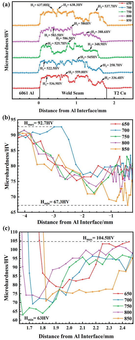 Microhardness distribution of joint under different laser power: (a) weld center. H1, H2, and H3 represent the maximum hardness values of the aluminum side weld, center weld, and copper side weld, respectively; (b) aluminum side; (c) copper side.