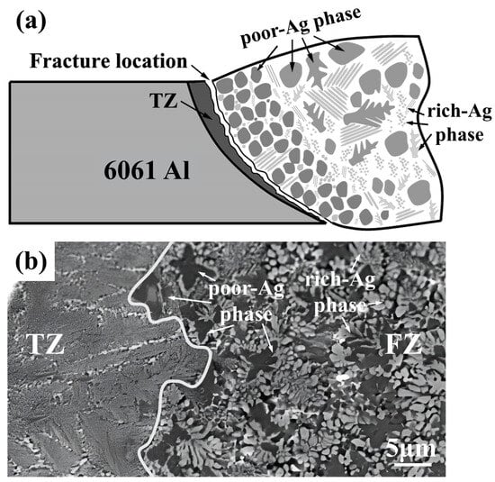 Figure 9a shows the schematic of the fracture location. Due to the improved microstructure of the FZ, the performance of the joint was enhanced, and the interface between the TZ and the FZ became a new weak part of the joint, as shown in Figure 9b. The reason may be that the structure between these two parts is obviously different, and there is a large area of black silver-poor grains aggregating at the interface, which is prone to stress concentration during stressing.