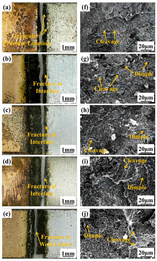 As shown in Figure 10a, the location of the weld fracture is not fixed, with cracks extending from the aluminum side through the weld center to the copper side. This is due to the non-uniform distribution of elements and composition in the weld at this power level, which leads to an irregular distribution of brittle and hard phases, resulting in stress concentrations at multiple points. As observed in Figure 10f, the fracture near the weld center exhibits flat pseudo-cleavage planes, dimples, and plastic tearing edges, indicating a ductile–brittle mixed fracture. The fracture locations in Figure 10b–d are in the interface between the TZ and the FZ, while in Figure 10e, the fracture occurs in the weld center. Based on the mechanical property test results, it can be inferred that the mechanical properties of the joint are better when the fracture occurs in the interface. Observations from Figure 10g–j show that the fracture mechanism of the joint remains a ductile–brittle mixed fracture under laser powers ranging from 700 W to 850 W.