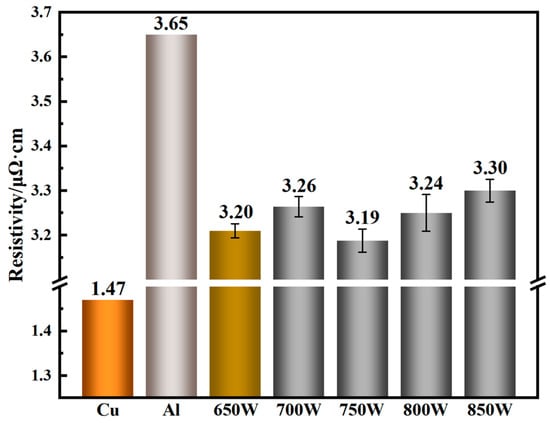 The resistivity of intermetallic compounds is typically an order of magnitude higher than that of the base material, making intermetallic compounds one of the main factors affecting the electrical conductivity of the joints []. As shown in Figure 11, with increasing power, the resistivity of the joints obtained at 650–750 W shows no significant trend in change. The difference in electrical properties between the joints produced at 650 W and 750 W is relatively small. This can be attributed to the fact that, although fewer intermetallic compounds form at 650 W, the presence of pores and other weld defects, as well as the inhomogeneous microstructure, negatively affects conductivity. In contrast, at 750 W, not only is the formation of intermetallic compounds limited, but no other factors degrade the conductivity, resulting in similar resistivity values at both 650 W and 750 W, despite the expectation of lower resistivity at 650 W. The sudden increase in resistivity at 700 W may result from the smaller cross-sectional area of the joint, as shown in Figure 3b, which prevents the cross-section from matching that of the base material, thus increasing the error in resistivity calculation. With a further increase in laser power, the increase in intermetallic compounds in the weld, the larger grain size, and the potential softening of the base material contribute to the rise in resistivity, reaching a maximum of 3.30 μΩ·cm. The aluminum/copper dissimilar metal welded joints produced using Ag-18Cu-10Zn filler material exhibit favorable resistivity, ranging from 3.19 to 3.30 μΩ·cm. Compared with the resistivity of the 6061 aluminum alloy base material (3.65 μΩ·cm), the resistivity of the joints is reduced by up to 12.6%.