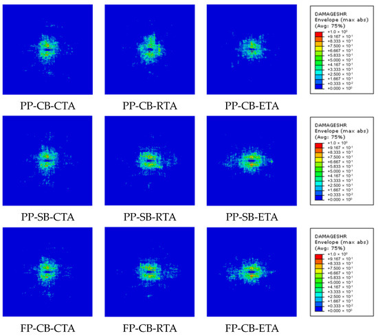 To compare the size of tensile damage areas in the base according to different factors, averages were calculated based on the results in Table 13, and the results were represented graphically as shown in Figure 17. Regarding adhesion processes, the damage area was significantly larger with secondary adhesion (4745.0 mm2) compared to co-bonding adhesion (4691.5 mm2), as shown in Figure 17a. Surface treatment resulted in varying damage area sizes with fuse plasma treatment (4839.1 mm2), peel ply treatment (4717.1 mm2), and sanding (4598.5 mm2) in descending order, as shown in Figure 17b. In terms of temperature, damage area sizes were observed in the order of 93 °C (4903.8 mm2), 23 °C (4721.3 mm2), and −53 °C (4529.7 mm2), as shown in Figure 17c. This suggests that lower temperatures increase the Hashin damage properties of the composite, resulting in smaller areas of damage.