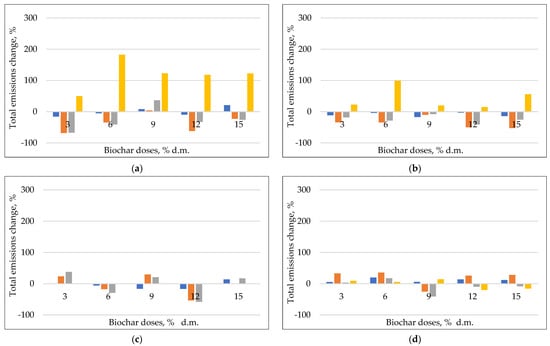 Unfortunately, in some cases, increases in CO2 emissions were observed, especially at 70 °C, and with biochar doses above 10% d.m. (Supplementary Table S1). The most effective CO2 reduction with the addition of biochar was at a temperature of 70 °C—the total reductions were up to 80% (Figure 3). Ottani et al. observed that the addition of 3–5% d.m. biomass biochar emitted 5% more CO2 than the control, with the p-values of the Tukey test being not significant. Ottani et al. explained that the addition of biochars facilitated the aerobic degradation processes of the organic substance, causing an increase in CO2 in the first 10 days of composting [60].