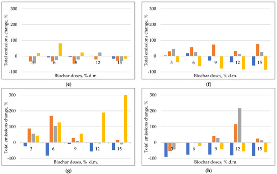 It was observed that emissions of CO increased with time and temperature (Supplementary Materials Figure S2), which was previously indicated with our own study [61]. This is an effect of the thermochemical reactions and biological activities of microorganism. The highest emissions of CO were registered at the beginning of the composting process, as found in other composting matrices like green waste, manure, and municipal solid waste [62,63]. The biggest emissions of CO were observed in variants with the addition of B650 ~2000 µg∙g d.m. All of the tested biochars show the highest emissions of CO at 70 °C (up to 1200 µg∙g−1 d.m.), in comparison to other variants where those cumulative emissions were ~500–800 µg∙g−1 d.m.