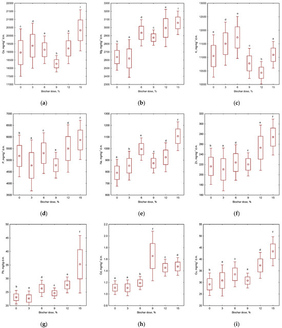 Effect of compost biochars’ addition dose for nutrients and heavy metal content in substrate after 10 days of composting (a) calcium (Ca), (b) magnesium (Mg), (c) potassium (K), (d) phosphorus (P), (e) sodium (Na), (f) zinc (Zn), (g) lead (Pb), (h) cadmium (Cd), (i) copper (Cu), (j) chrome (Cr), (k) nickel (Ni), (l) manganese (Mn), and (m) mercury (Hg). Letters (a, b, c, d, e, f) indicate the homogeneity group according to Tukey’s test at significance level p < 0.05.