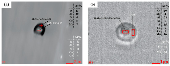 In addition, double-layer complex inclusions containing Ce were found in Sample S3 with rare earth additives, as shown in Figure 8a. Double-layer complex inclusions containing Ce inclusions were found in Sample S4, as shown in Figure 8b. These two types of double-layer inclusions have a regular morphology and smaller size than those without the rare earth additive. With the increase in Ce content, complex inclusions containing CeAlO3 wrapped by MgO-CeAlO3 were found in Sample S5, as shown in Figure 8c. It is noteworthy that Al-Ca-Ce-O-S double-layered composite inclusions were found in Sample S5, as shown in Figure 8d. According to the calculation results of Figure 5c and equation (6), it is not difficult to find that with the increase in Ce content, some CeAlO3 inclusions will react with S, O and other elements to form Ce2O2S inclusions [25], and according to the energy spectrum atom percentage in Figure 8d, it can be deduced that the core part of the inclusion is a complex inclusion containing Ce2O2S. The low Ce content may be the reason for the absence of Ce2O2S inclusions in Samples S2–S4.