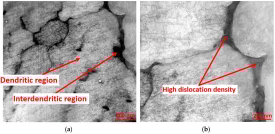 After the homogenization heat treatment, the regular dendritic structure disappeared (Figure 9). In general, after heat treatment, this alloy precipitates a delta phase with the morphology of the particle. In the background, delta-phase precipitates were observed (Figure 9a). Because the presence of the delta phase has been widely reported by previous authors [49], no detailed investigations were carried out. In addition, we also observed the γ and γ″ phases precipitating in the γ matrix (Figure 9b).