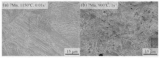 The microstructures of various steels subjected to different hot working conditions are depicted in Figure 8. Across all steels, the formation of martensitic microstructures during the cooling phase is evident. Figure 8a,b present the microstructures of 7Mn under varied hot working conditions, predominantly comprising martensite and retained austenite. However, the morphology and size of martensite differ based on distinct deformation processes. At 1150 °C and 0.01 s−1, martensite predominantly displays a lath-shaped structure. In contrast, at 900 °C and 1 s−1, two distinct forms—lath and block—are observed, with the former notably smaller in size compared with the latter.