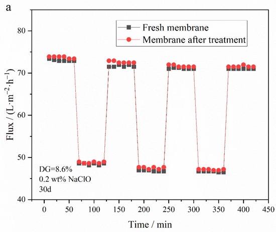 Initially, a variety of membranes were submerged in a NaClO solution with a concentration of 0.2 wt% for a duration of 30 days, with the NaClO solution being refreshed daily to maintain consistent concentration levels. The performance of each membrane, in terms of water flux and BSA rejection rates, was documented on the 1st, 7th, 14th, and 30th days. Furthermore, a modified membrane, possessing a DG of 8.6%, was also immersed in the NaClO solution for 30 days. Following this period, it was thoroughly rinsed with pure water, and a circulation flux test was conducted. The resistance of the membrane to oxidation by NaClO solution was assessed based on these two investigative approaches.