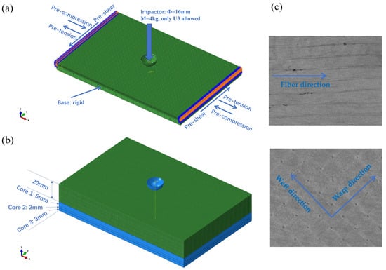 For the composite materials of UDLM and WOVN, denoting unidirectional tapes and two-dimensional fabrics, the material properties possessed are shown in Table 2, in which the 1 and 2 refer to directions along and perpendicular to the fiber in UDLM and warp and weft direction (refer to Figure 1), respectively. In addition, core-1, core-2, and core-3 are three groups of laminates considered to provide stiffness, for which the elastic properties are listed in Table 3. During the manufacturing process, these three core layers were prepared prior to the initiation of the 20 mm structural layup of the main body. In addition, the fracture energies of woven fabrics are assumed to be G1t = G1c = G2t = G2c = 11 N/m [], while for the cohesive elements representing the interface between the lamina, the power exponent corresponding to the B-K criterion is 1.45. The cohesive strength is taken as 75 MPa for mode I and 45 MPa for mode II and mode III. Moreover, the value of toughness for mode I, II, and mode III are 0.7, 1.4, and 1.4 N/mm, respectively.