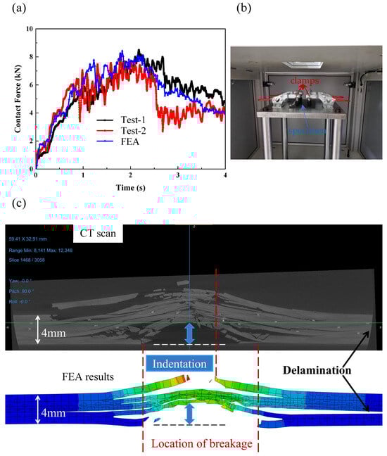 Comparison of simulation and test of the LVI of hybrid plate (Type-A): (a) the contact load–time curves; (b) the installation of specimen; (c) CT (upper) and FEA (lower) results of the mid-span section after impact.
