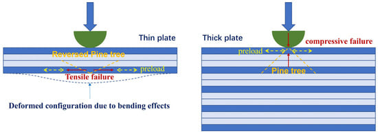 In this section, we first compare the differences between the LVI response of thin and thick composite plates under preloading. Generally, the two have different ways in which they fail. As shown in Figure 3, when thicker composite laminates are hit, the intense pressure at the point of impact can cause tiny cracks to form on the surface. These cracks then grow downward, creating a pattern that looks like the branches of a pine tree. But in thinner laminates, things play out differently. Here, the bending stress causes cracks to start at the bottom layer first. From there, cracks within the layers and separations between layers spread upward, eventually creating a pine branch-like pattern on the surface, but in reverse [].