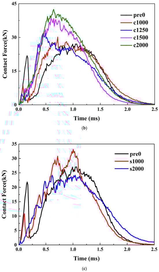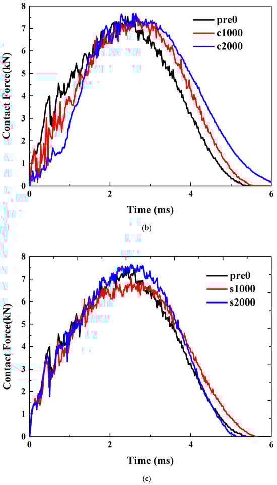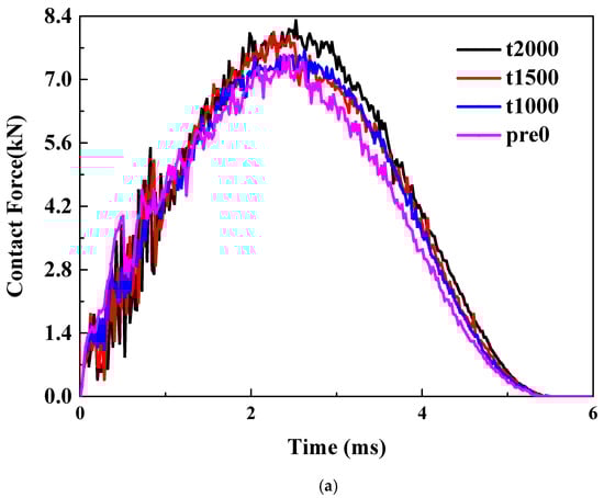 Precompression. The effect of compressive preload on the impact load of thick plates is highly significant. Firstly, regarding the peak force, compared to the scenario without preload represented by the black curve, when the compressive prestrain reaches 2000 με, the peak load increases by more than 50% (42/27 − 1 ≈ 55%), as demonstrated in Figure 5b. The trend of the curve also shows a notable difference, as the occurrence time of the peak force advances with the increase in compressive preload. Lastly, for the initial rise and subsequent fall observed in the curve’s ascending phase, this phenomenon becomes less pronounced when the compressive prestrain exceeds 1000 με.