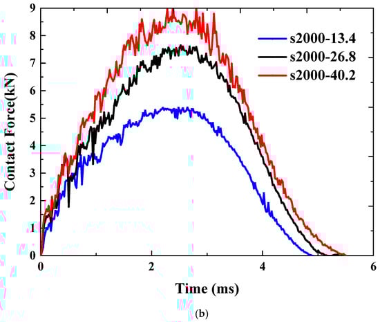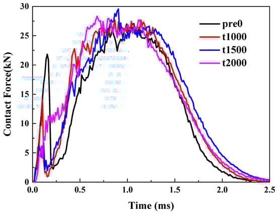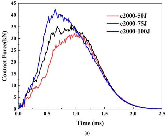 In this final section, we present the results of the thick plate under the influence of compressive prestress (2000 με) when subjected to impacts at various angles. In other words, all the previous results pertain to normal impacts with an impact angle of zero. As illustrated in Figure 8, two cases of oblique impacts are compared with the normal impact scenario. As can be observed in the figure, the load curve under normal impact is the highest, indicating that this represents the most hazardous operating condition.