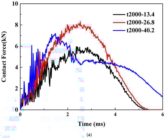 The pretension and pre-shear conditions are considered for the thin plate of Type-A. As illustrated in Figure 6a, under a tensile strain of 2000 με, the load–time curves exhibit significant differences when subjected to three distinct impact energies. As the impact energy increases from a relatively low 13.4 J (the case denoted by black curve) to 26.8 J (the case denoted by red curve), the maximum impact energy shows an approximate 50% increase, while the overall trend of the curves remains consistent. However, under a higher impact energy of 40.2 J, the altered trend of the curve suggests a different failure mode. The comparison under a shear strain of 2000 με is shown in Figure 6b. The trend of the curves remains consistent, indicating no change in the failure mode. As the impact energy increases, the peak impact force also rises. Upon closer examination, it can be observed that the rate of increase gradually slows down.