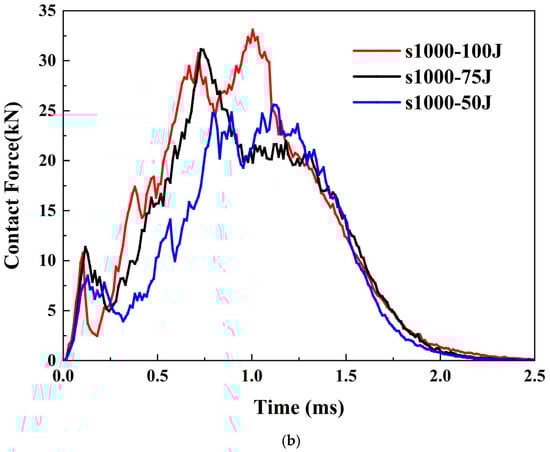Meanwhile, for the thick plate of Type-B, the precompression and pre-shear are considered. Under a compression strain of 2000 με, as presented in Figure 7a, the curves under three different impact energies exhibit consistent trends, indicating the same failure mode. As the energy increases, the curves also rise accordingly. Across the three energy ranges being compared, the magnitude of the peak increase appears to grow progressively. Specifically, an increment of 25 joules results in a more pronounced enhancement when increasing from 70 to 100 joules compared to other ranges. Finally, the impact energy effects were compared under the condition of 1000 με shear strain. As shown in Figure 7b, the descending segments exhibit minimal differences, whereas the ascending segments demonstrate a clear upward trend as the energy increases.