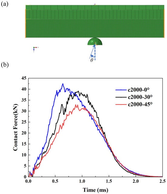 Effects of impact angle on LVI response of thick plate under precompression. (a) explanation of impact angle; (b) comparison of contact force.
