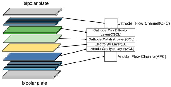 Figure 3 shows the detailed structure of the SOEC battery cells, which were designed based on the experimental scheme proposed by Nagata et al. []. Among them, the bipolar plate is composed of stainless steel, the cathode gas diffusion layer (CGDL) and cathode catalytic layer (CCL) are composed of Ni–YSZ, the electrolyte layer (EL) is composed of Y2O3 stabilized ZrO2 (YSZ), and the anode catalytic layer (ACL) is composed of LSM.
