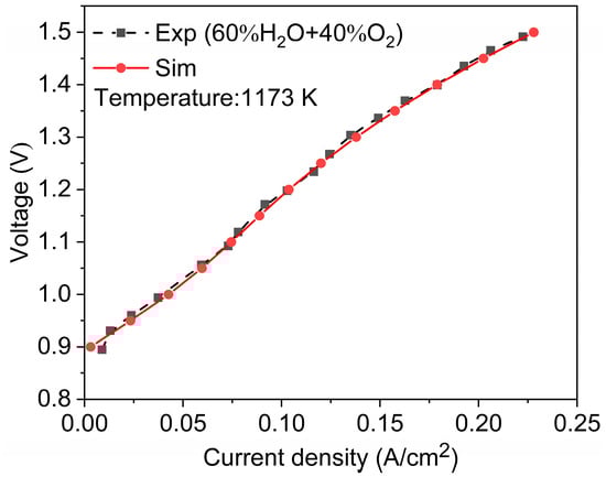 To verify the accuracy of the model, we compared experimental data and simulated data from the publicly available literature []. Both adopt the same geometric model and operating conditions and then analyze their polarization curves (Figure 4). After calculation, the maximum relative error is about 2%. The highly similar polarization curves of the two demonstrate the accuracy of the established model.
