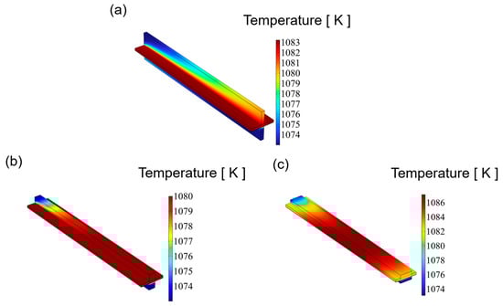 Figure 5 illustrates the temperature distribution of an SOEC at 1.4 V for channels with varying aspect ratios. In multi-physics coupling, the temperature is influenced by the fluid flow. Among three distinct flow fields, the highest temperature is observed on the CGDL, primarily due to the hydrogen electrode as the primary site for electrochemical reactions, which generate significant heat. The highest temperatures, in ascending order of aspect ratio, are 1083.2 K, 1081.6 K, and 1087.1 K. For the SOEC cathode channels with aspect ratios of 0.25 and 1, the temperature distribution is relatively uniform, exhibiting an increasing trend, with the peak temperature occurring at the outlet of the cathode channel. Conversely, for the SOEC cathode channel with an aspect ratio of 4, the highest temperature is found in the middle of the channel, and this maximum temperature surpasses that of the other two channels. Excessive temperature differences can readily induce thermal stress, potentially leading to cracking or even failure of the SOEC. A reduced temperature difference is advantageous for enhancing the lifespan of an SOEC.