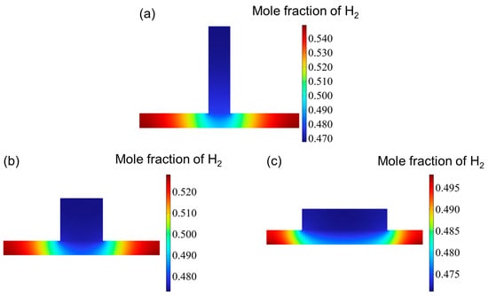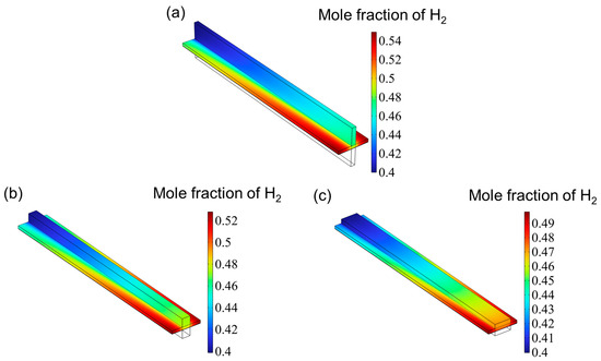 The mole fraction distribution at hydrogen outlet for three types of flow channel: (a) aspect ratio = 0.25, (b) aspect ratio = 1, and (c) aspect ratio = 4.