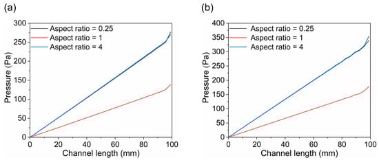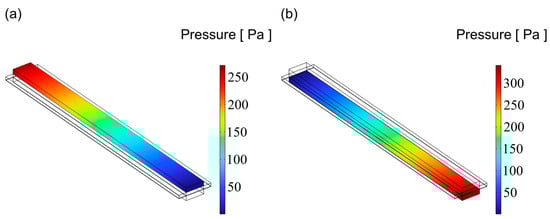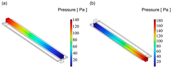 The distribution of pressure for flow channel with an aspect ratio = 4: (a) cathode channel and (b) anode channel.