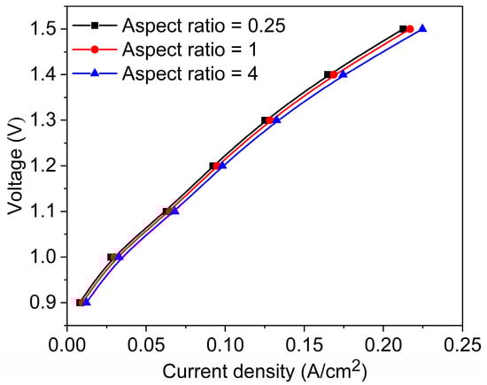 Figure 13 illustrates the polarization curves for three channels with different aspect ratios. A lower aspect ratio (aspect ratio = 0.25) corresponds to a narrower and taller channel, which results in a longer gas flow path and reduced flow velocity, meaning the gas requires more time to pass through the entire channel. During this process, the increased surface contact with the channel walls leads to greater frictional resistance, causing a higher pressure drop. This elevated pressure loss contributes to increased ohmic polarization, thereby resulting in a higher overall cell voltage as reflected in the polarization curve. Furthermore, narrow and tall channels often exhibit greater flow non-uniformity, which can lead to uneven gas distribution. Consequently, certain regions of the catalyst layer may be underutilized or suffer from insufficient reactant supply, ultimately reducing the overall reaction efficiency. This design is only suitable for low current density or short-term operations to prevent performance degradation due to gas retention. Conversely, under high aspect ratio conditions (aspect ratio = 4), the channel is wider and shorter, offering reduced gas flow resistance and enhanced mass transfer efficiency. Compared to narrow and tall channels, flat geometries significantly reduce the diffusion path from the bulk flow to the catalyst layer, thereby lowering mass transfer resistance. Moreover, the reduced channel height leads to thinner concentration boundary layers, which enhances the local concentration gradients and accelerates species diffusion. Additionally, flat channels inherently provide a larger surface-to-volume ratio, offering a more extensive gas–solid interface per unit volume and improving the contact efficiency between reactants and the catalyst surface. The shear flow developed along the broader wall surface also helps refresh the boundary layer, promoting convective mixing and further enhancing reactant delivery. As a result, the combination of short diffusion distances, thin boundary layers, and increased interfacial area makes wide and flat channels more effective in sustaining high mass transfer rates, which ultimately contributes to improved electrochemical performance. This configuration can mitigate concentration polarization and enhance electrolysis efficiency. As evident from the graph, the current density range is broader, indicating that a higher current density can be maintained even under high voltage, making it ideal for high current density operations. The balanced design (aspect ratio = 1) not only has good electrochemical performance, but also has simple processing methods and low processing costs. Therefore, it is the simplest flow channel design method, which is widely used in conventional water electrolysis or CO2 co-electrolysis.