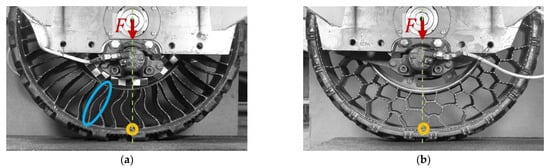 In the case of NPTs, the type of elastic structure used affects their flexibility in the circumferential direction, which translates into the curved course of the longitudinal stiffness characteristic of the NPTs. Figure 7 shows the deformations of the NPTs’ spoke and layer structure used in Utility Terrain Vehicle (UTV) during the measuring of the longitudinal stiffness characteristic in quasi-static conditions (NPTs were vertically loaded to the measuring track and cannot rotate—brakes on). The orange circle marks the connection of the elastic structure with the outer ring located under the wheel axle. As a result of the movement of the measuring surface (track), the analyzed point moved. The spoke structure was more susceptible to longitudinal displacements than the analyzed cellular elastic structure. Deformations of the spoke elastic structure as a result of the movement of the measuring track are particularly easy to observe. The blue line marks one of the spokes, which buckled under the influence of a vertical load (Figure 7a) and stretched under the influence of a longitudinal force (Figure 7c). The cellular elastic structure is less susceptible to deformations in the longitudinal direction (Figure 7b,d).