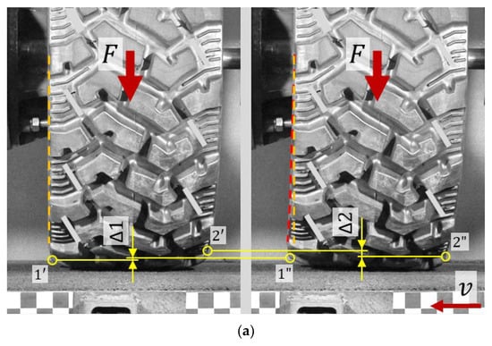 The deformation of commercially available NPTs during the measuring of lateral characteristics in quasi-static conditions is shown in Figure 8. The left part of the figure shows the NPTs loaded with the force to the measuring track. The right part of the figure shows the NPTs, for which the measuring track additionally moves at the speed . In order to identify the influence of the elastic structure on the range of displacements, points located on the side parts of the wheel were selected. Points marked as 1 moved upwards as a result of the lateral deflection of the NPTs, while points marked as 2 moved downwards. By observing the displacement ranges (, ) of the analyzed points before (1′, 2′) and after the displacement of the measuring surface (1″, 2″), it can be observed that the NPT with the spoke elastic structure is more susceptible to lateral deformations. The cellular structure located under the wheel axle counteracts lateral deformations of the belt with the tread. The range of displacements can also be observed by analyzing the deformation of the NPT’s side before (orange line) and after displacement of the measuring track (red line).