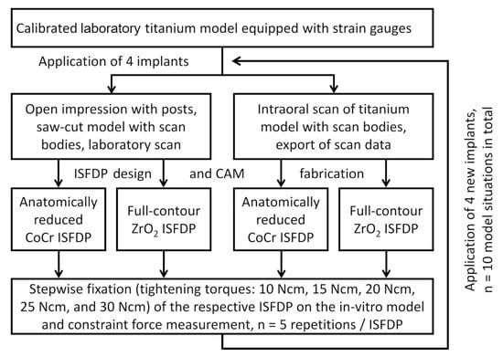 However, the mechanical behavior of screw-retained ISFDPs on four implants and their force transmission on the implants has not been well studied. Potential errors or imperfections during the manufacturing process of one-piece long-span ISFDPs could affect the fitting accuracy of ISFDPs. These errors could occur during intraoral scanning (IOS), during the conventional impression (CI) technique, following model cast production, or during computer-aided design/computer-aided manufacturing (CAD/CAM), and can cause clinically relevant inaccuracies that exert constraint forces on the implants when the restorations are screwed in place. The effects of these constraint forces on the implant body and surrounding bone are unknown. The aim of the present laboratory study was to assess the fitting accuracy of 12-unit complete-arch ISFDPs made from cobalt–chromium alloy (CoCr) and ZrO2 supported by four implants at positions 15, 12, 22, and 25 in a maxilla model. By measuring constraint forces between implants and restorations that were fixated on adhesive titanium-base abutments, fitting accuracy of the secondary structure could be calculated indirectly. The first study hypothesis was that the fitting accuracies of complete-arch ISFDPs made from CoCr and ZrO2 would differ. The second study hypothesis was that the fitting accuracy of ISFDPs would not differ between conventional and digital impression techniques.