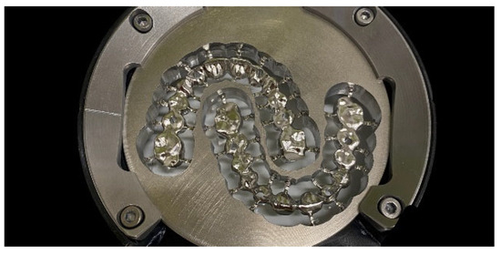 Cavities for the adhesive bases were milled with a previously adjusted offset parameter (CoCr: −10 µm and ZrO2: −12.5 µm) to achieve the best fit between the adhesive base and ISFDP. The parameters were chosen based on preliminary tests of milling, manual fitting, and trial bonding. For the ZrO2 ISFDPs, a sintering frame was added during the nesting process. The sintering frame with framework was positioned upright in the furnace (Cercon heat plus, DeguDent GmbH, Hanau, Germany) and was sintered at a final temperature of 1500 °C for 14.5 h (Figure 6).
