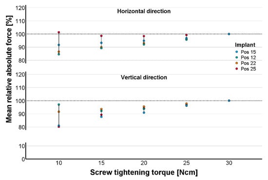 The averaged constraint force at the final screw tightening torque of M = 30 Ncm was used as the reference (100%) for all other corresponding values at lower torques. For horizontal and vertical constraint forces, the relative changes recorded between successive torques decreased with increasing tightening torque. Between 25 and 30 Ncm, the relative changes were smaller than 5% for all implant positions (Figure 7). Thus, only minor changes would be expected for even higher screw tightening torques.