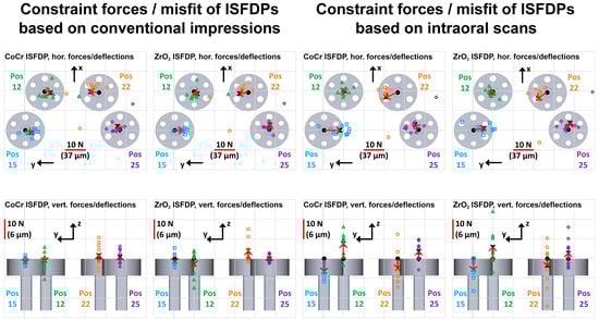 The horizontal constraint forces measured for all test groups are displayed in Figure 8. The constraint forces (corresponding post deflections) averaged over each of the ten measurements were plotted as red vectors originating from the respective nominal implant position. These averaged vectors were, in the horizontal direction, mostly oriented along the dental arch or directed towards the central area, indicating that the ISFDPs were too small. In the vertical direction, ISFDP misfits typically resulted in each of the two implants experiencing either tensile or compressive forces. In the CI group, this was rather random, but in the IOS group, the vertical constraint forces followed a pattern—i.e., compressive forces acted on implants in positions 15 and 22, and tensile forces acted on implants in positions 12 and 25.